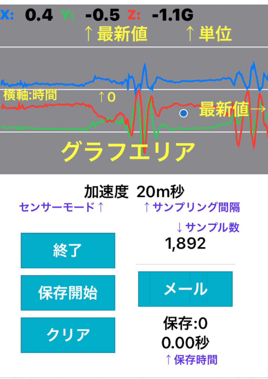 この「加速度ロガー」はiPhone内臓の加速度センサーのデータを計測して、そのCSVファイルをメールでパソコンなどに転送することができるソフトです。