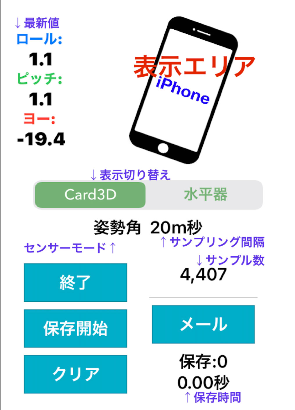 ※姿勢角モードの場合、立体表示(Card3D)と平面表示(水平器)の切り替えが可能です。画面裏が重力方向にして計測してください。水平器表示は、青丸が左右前後の傾き(ロールとピッチ)に対応します。赤丸が方角(ヨー)です。